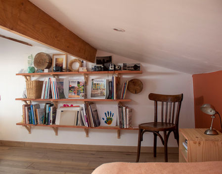 Deux pièces à vivre pour ces combles aménagés : un espace bureau et un espace jeu/chambre d'amis. Pour le bureau des parents, nous avons limité au maximum les meubles pour ne pas encombrer cet espace sous rampants, bas de plafond : des étagères murales notamment, permettent de ranger des affaires et d'y intégrer subtilement deux poutres circulaires ! Une niche existante sert de coin lecture, pratique quand maman doit travailler et s'occuper des enfants ! Dans l'autre espace, deux niches ont été conçues pour ranger des jeux, permettant aussi d'apporter un rythme vertical a cet espace très longitudinal. Les peintures murales ont été faites à la caséine (chaux, eau, caséine, pigments).